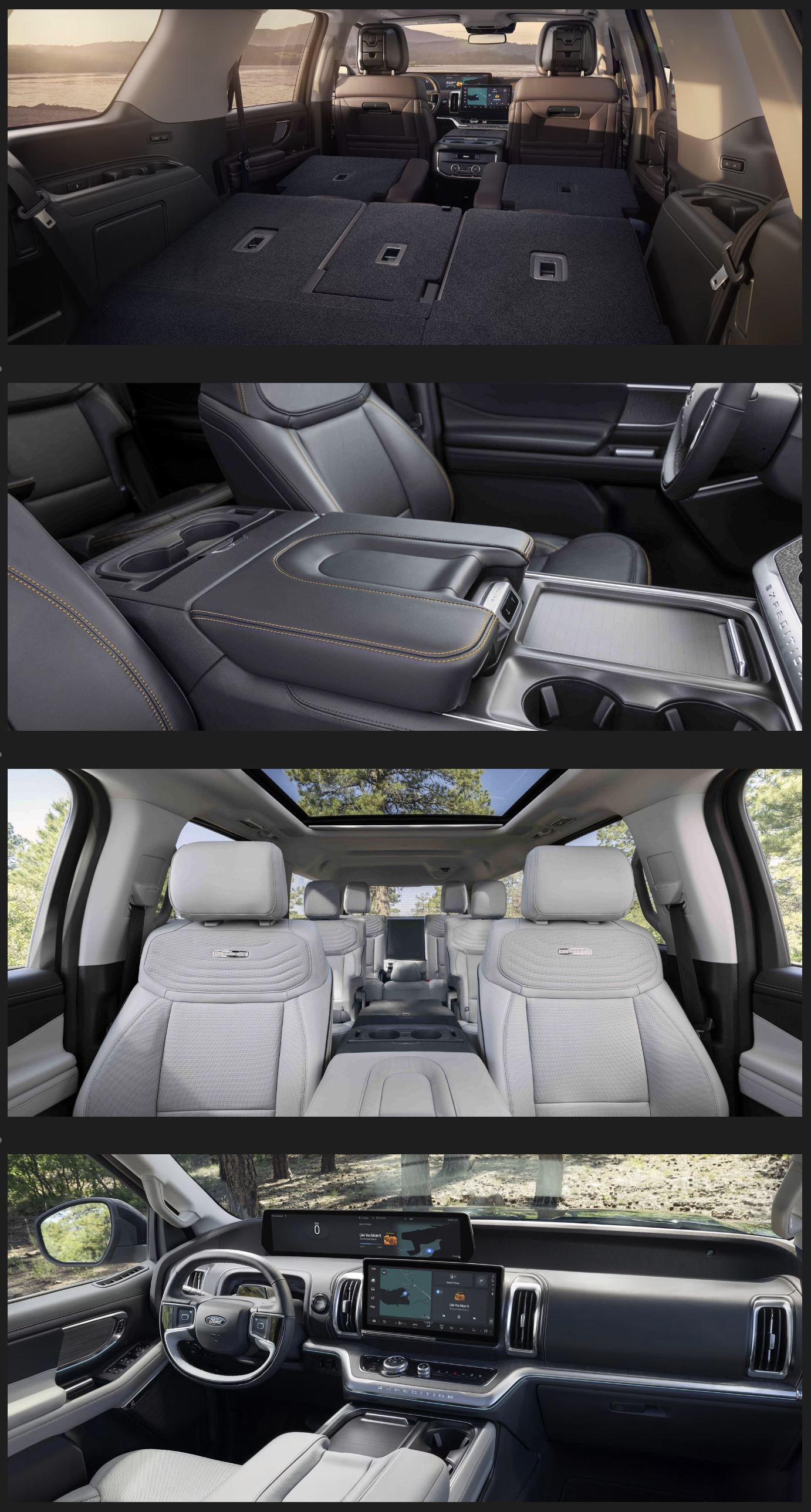 국내 도입되는 익스페디션은 플래티넘 트림 중심으로 고급화를 꾀했습니다. 실내는 넓이뿐만 아니라 고급스러운 소재와 첨단 기술의 조화로 '미국식 럭셔리'의 진수를 보여줍니다. 운전자를 감싸는 듯한 12.4인치 디지털 클러스터는 시인성과 함께 미래지향적인 분위기를 연출하며, 중앙에 위치한 15.5인치 대형 터치스크린은 직관적인 조작이 가능한 포드 SYNC 4 인포테인먼트 시스템을 탑재하여 최신 커넥티비티 기능을 제공합니다.